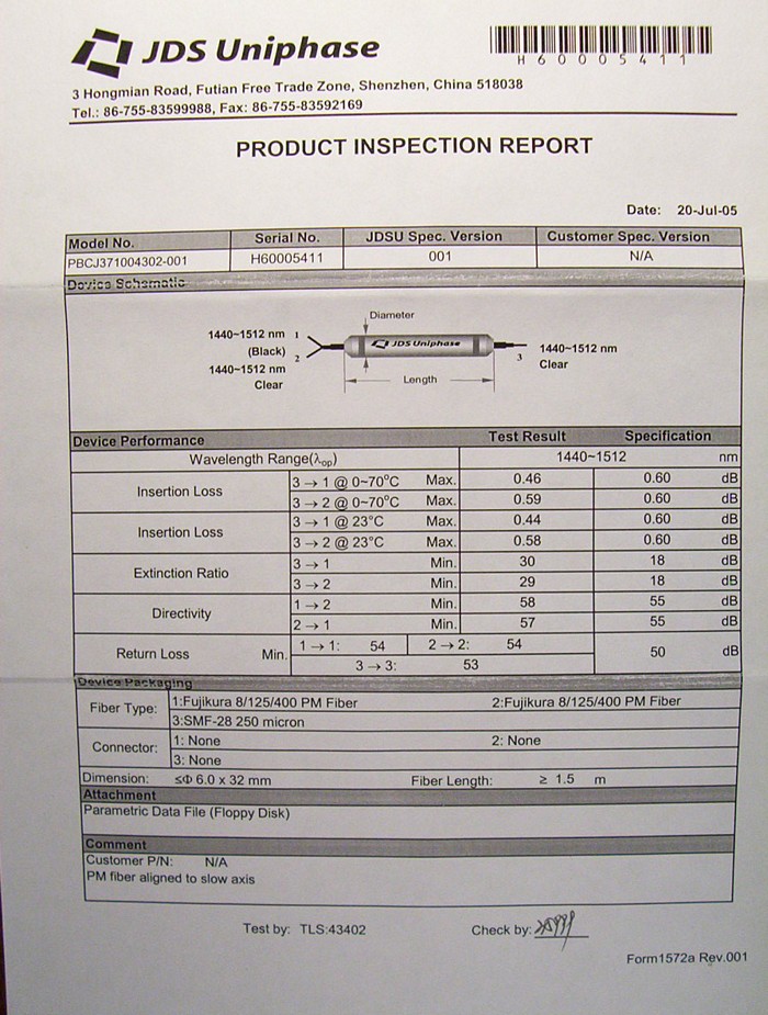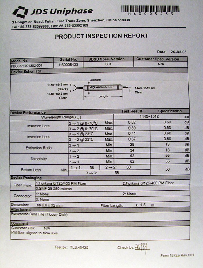 (1440-1512)nm 1x2 polarization combiner. JDS P/N: PBCJ371004302-001
