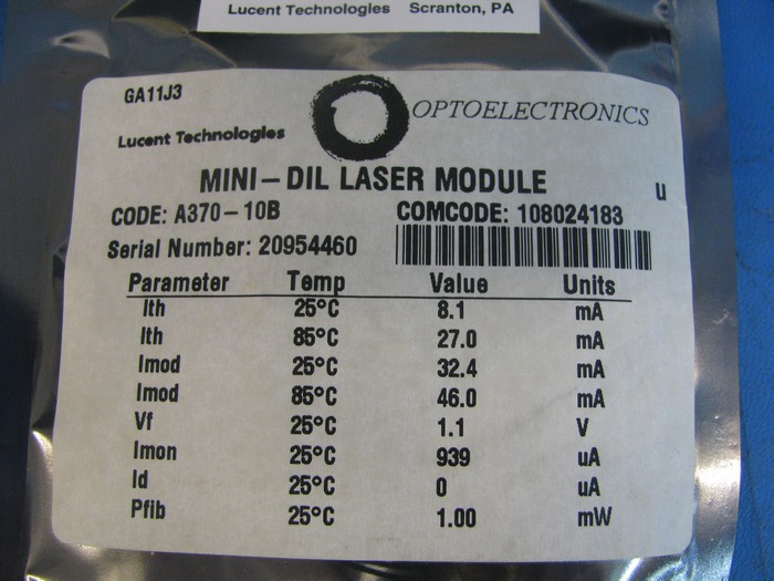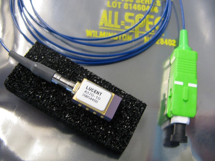 $17 each if buy 4pc. ~1.31um 1GHz 1mW analog laser module in mindil package. Lucent P/N: A370-10B. (Product is mistakenly labeled as A370-10F/G/A).With SC/APC fiber connector