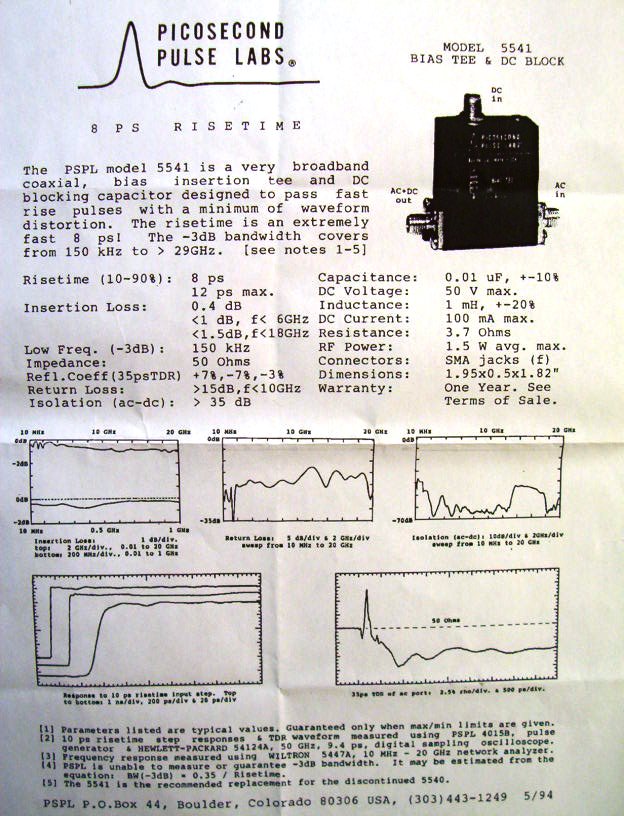 Picosecond Pulse Labs model: 5541-104. 150KHz-29GHz Bias Tee. All three ports are female SMA interface. See specification at last photo below. See pdf link below for spec and application notes.