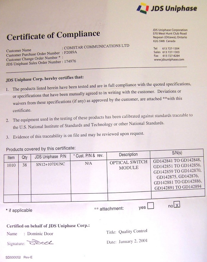 We found some “Certificate of Compliance “ of JDS which is inside product box, one certificate covers 38pc products, as shown at last two photos below. We very believe all products should be covered by JDS “Certificate of Compliance “, though we do not have time to search all the “Certificate of Compliance “ in all product boxes.