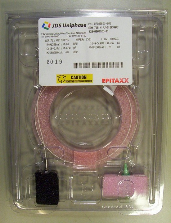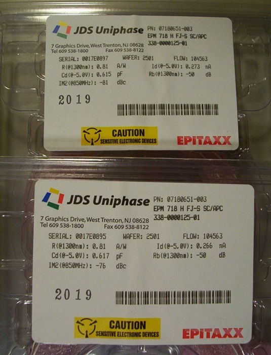 Optimized for 1.31um analog CATV, but it should be also suitable for 1.55um. 900um-buffered single-mode fiber with SC/APC connector. Single-mode fiber is verified over fiber scope in our lab.  Model: EPM 718 H FJ-S SC/APC.  P/N: 07180651-003.  The 1st pdf link is preliminary specification from an older product by Epitaxx with same model number. Comparing with the 2nd pdf datasheet link below, it looks equivalent to EPM 705 forward path analog CATV detector.