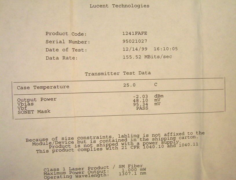 1.3um, Lucent FP laser transmitter 1241FAFE, OC-3