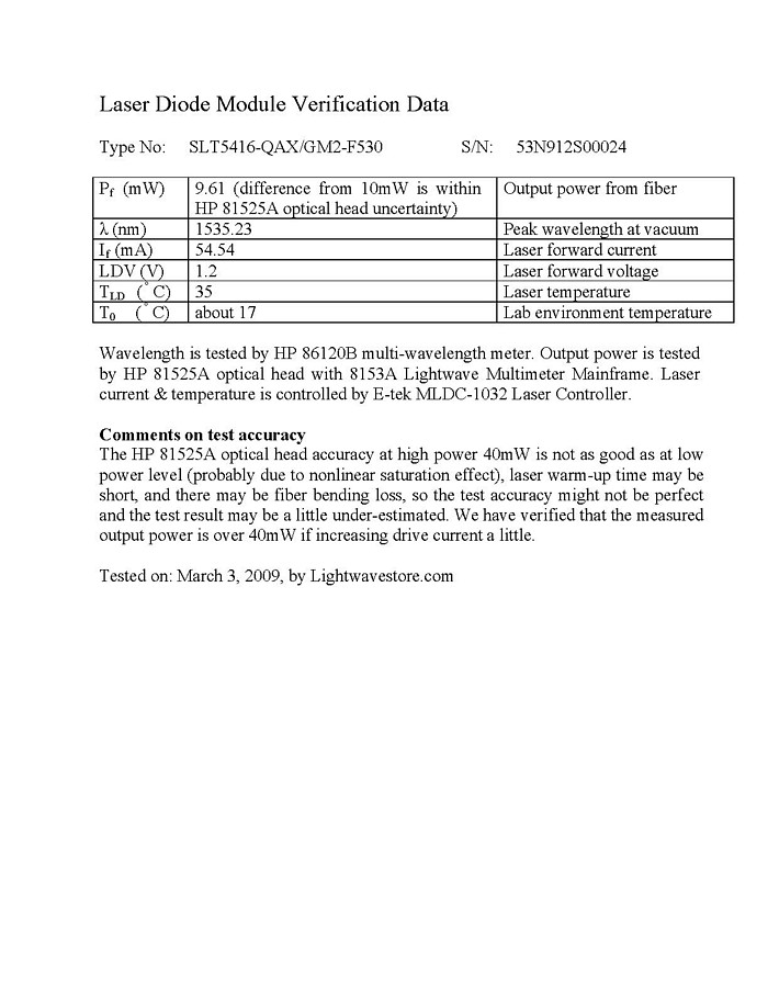 5mW-average, 10mW-peak ( at "1 " in digital signal). With SC/APC single-mode fiber connector, 900um-buffered fiber. 14-pin butterfly package. 2.5Gb direct modulation. SLT5410, SLT5412, SLT5414, SLT5416 are designed for direct modulation with SMF. The output power of SLT5410-xA is 10mW at “1” code of signal (Ppeak) and 5mW of average of “1” code and “0” code (Pave). If you use it for CW mode(continuous wave), it would support 10mW (continuous “1” code) at worst case, but the manufacturer test sheet normally only gives data at average power 5mW. The life time may change if you use as 10mW at CW mode, see reliability report at last pdf link below.SLT5411, SLT5413 are designed for external modulation with PMF, so normal lasing condition is CW mode (continuous wave).