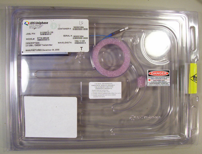 57TM transmitter: 45Mb/s to 2.7 Gb/s 100GHz DWDM transmitter. Temperature tunable over two 100GHz channels (n, n-1). Typical average power 7dBm. 3200ps/nm dispersion 180km. -15 to 80 degrees . This transmitter includes 10mW temperature tunable WDM laser module, JDS P/N: CQF413/608 (see specification at CQF413/608 ).