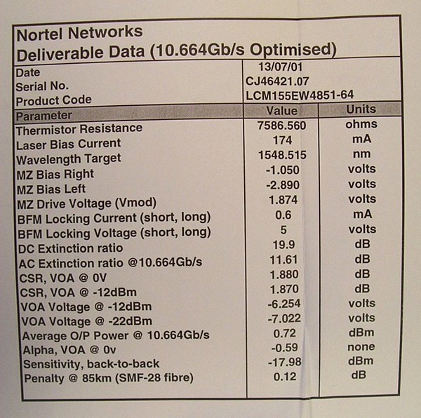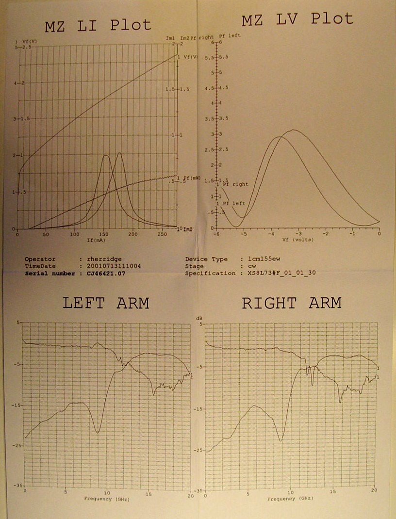 10 Gb/s InP Mach Zehnder Modulator with 1548.51nm DWDM Laser, with negative chirp, dual RF drive with SMA connector, Bookham model: LCM155EW4851-64