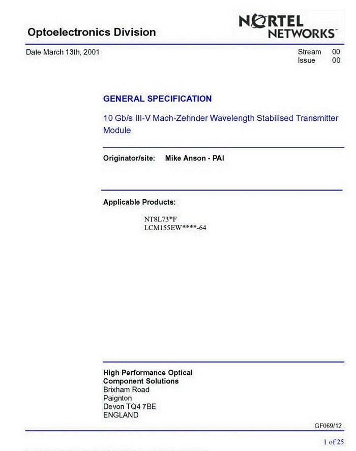 The 10 Gb/s InP Mach Zehnder Modulator with DWDM Laser, containing the Bookham Technology Strained Layer MQW DFB laser chip and the InP Mach-Zehnder modulator chip, has been designed specifically for use in 10 Gb/s long distance optical fibre trunk systems. Thermo-electric heatpumps, a precision NTC thermistor and optical isolator are incorporated. By using the rear back facet monitors, the integrated Etalon locker allows wavelength locking to the 50 GHz ITU grid. The module is capable of >80 km transmission over Non Dispersion-Shifted Fibre (NDSF) without additional dispersion compensation. This is achieved by the negative chirp characteristic, which compensates for 1500 ps/nm dispersion. Increased transmission distances are possible using multiple spans of NDSF with dispersion compensation. Optical power control is achieved by applying a D.C. bias voltage to the internal attenuator electrode. This reduces the power into the modulator section without affecting the operating wavelength.
