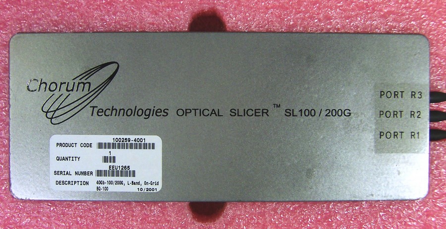 40Gb-100/200G, L-band, On-Grid BQ-100. 100GHz-to-200GHz L-band interleaver. We checked each side of the interleaver module (see 3rd photo below), there is no electrical interface, so it is athermal package, temperature controller is not required. With 3 LC/PC connectors. Made for Lucent. With manufacture test data, see last pdf link below.
