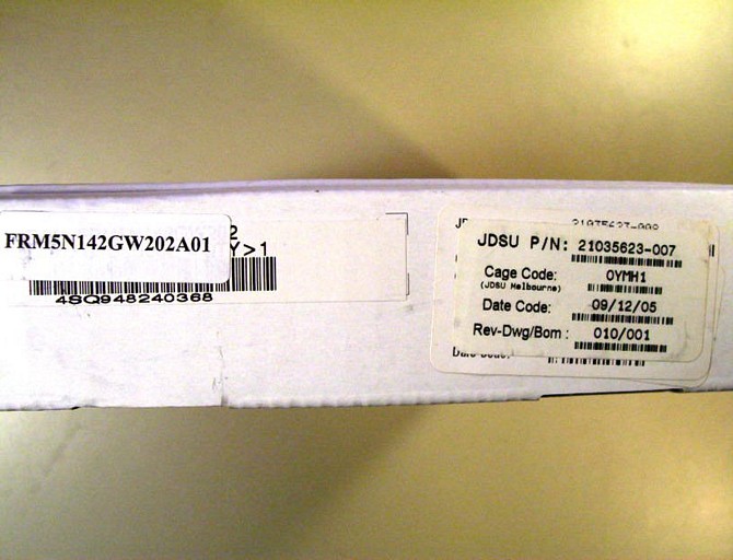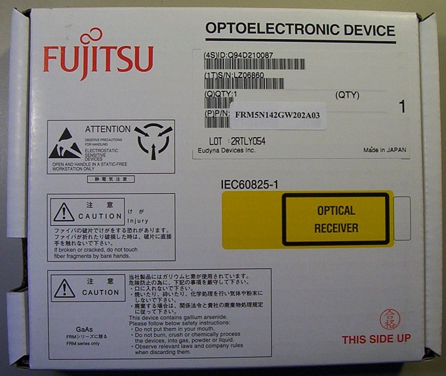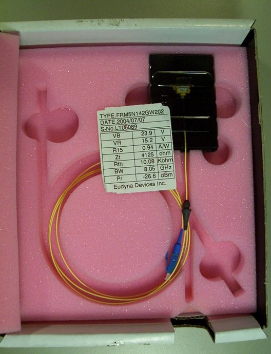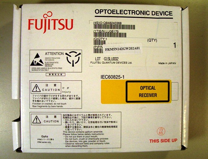 10Gb APD/Preamp receiver. -27dBm sensitivity.  With LC/SPC fiber connector.  No pin-out info. With test data on product label. On March 10, 2010, there are 5pc for model: FRM5N142GW202A01 (see 1st 5 photos), and 3pc for FRM5N142GW202A03(see last 3 photos). These two models look same. One unit of FRM5N142GW202A01 lost the test data (mini paper sheet) and will be sold as last one.