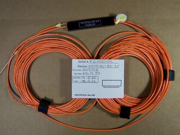 1300/1550nm High Isolation WDM, universal bidirectional coupler for 1300nm and 1550nm channels.  50/125/3000um fibers on all 3 ports. Without connectors, JDS P/N: WD1315U-B2-3.5
