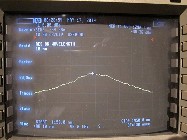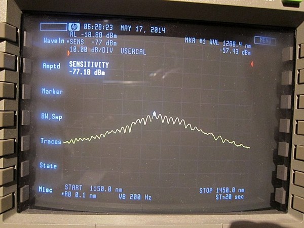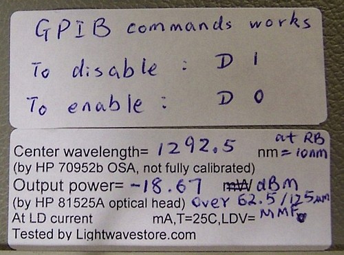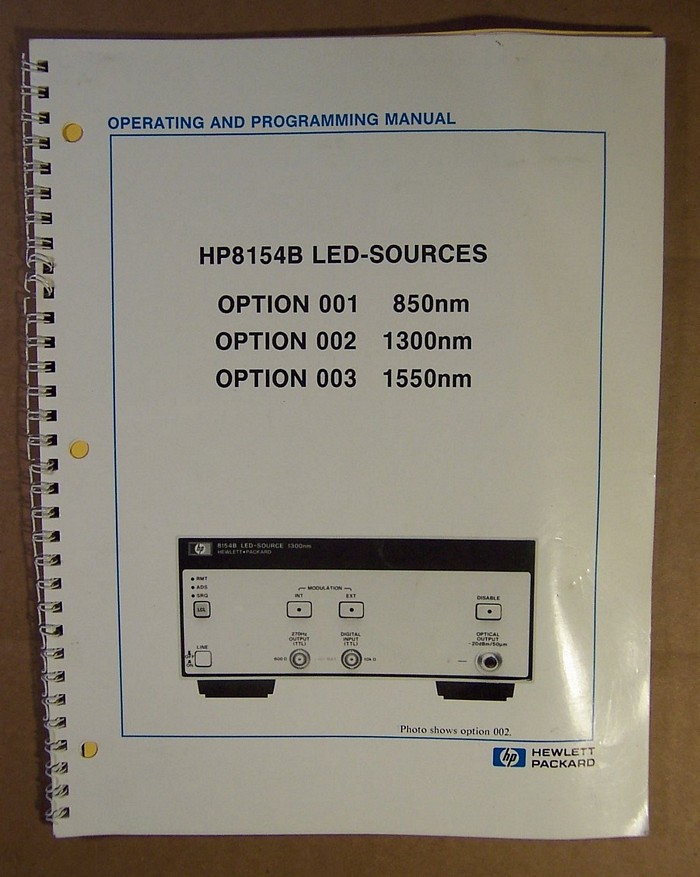 HP 8154B 1300nm LED source. 50um/125um MMF optical interface. Total output power is tested as -18.7dBm after 62.5/125um MMF patchcord, by HP8125A optical head at our lab. Peak wavelength is about 1289nm, see optical spectrum test result at the last 2 photos below, with RB=10nm and RB=0.1nm respectively (OSA is not fully calibrated, and OSA interface is SM fiber patchcord, so the power data in OSA is at least 10dB under-estimated). It looks bandwidth is over 60nm. It comes with Operating and Programming Manual, see 5th photo below.