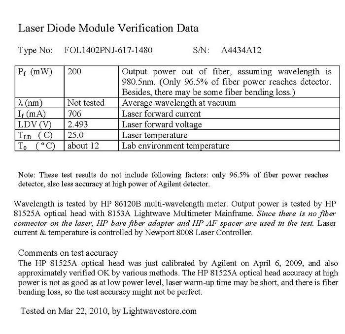 Removed from EDFA module, desoldered. In non-original product case, without manufature test data. Fiber is quite long including FBG (the 1-inch blue fiber is FBG in the 1st photo below). Tested good at our lab, see last photo for our test result.We verified another sample that the peak wavelength of FOL1402PNJ-617-1480 is very close to 1480nm.