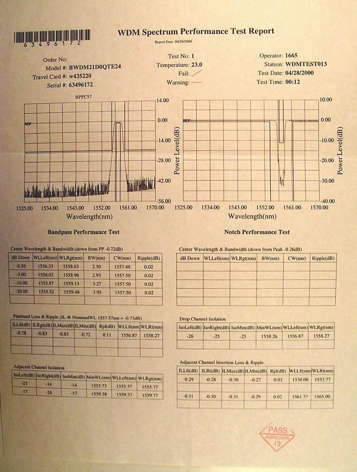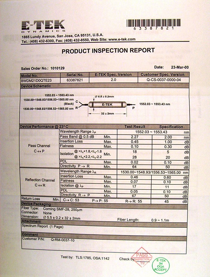 WLpeak=1556.87– 1558.27nm, BWDM21D0QTE24, with test sheet, new in product pack, WLpeak=around 1528.83nm, BWDM21D0QTE18, without test sheet, new in product pack, WLpeak=around 1490.43nm, BWDM21D0QTE10, without test sheet, new in product pack, WLpeak=around 1485.63nm, BWDM21D0QTE09, without test sheet, used but still in product pack, output fiber is shorter than specification but still very long for lab use, used but still in product pack.
