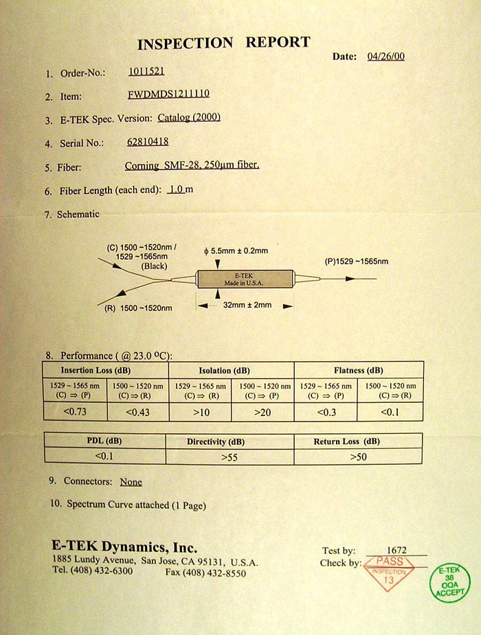 1510nm/1550nm WDM. Pass:1550nm, Reflect: 1510nm. JDS P/N: FWDMDS12111110