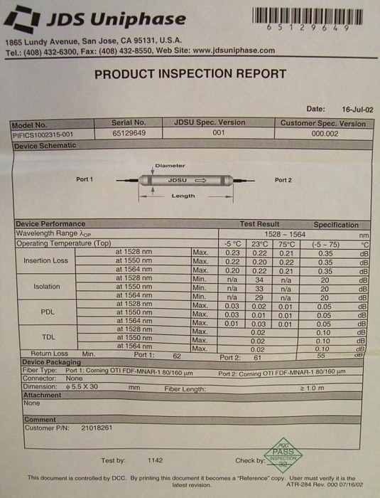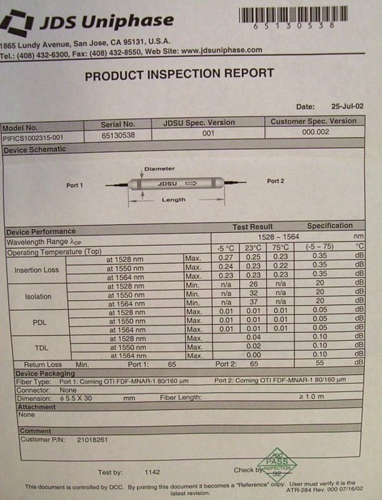 1528nm - 1564nm isolator. Model: PIFICS1102315-001.