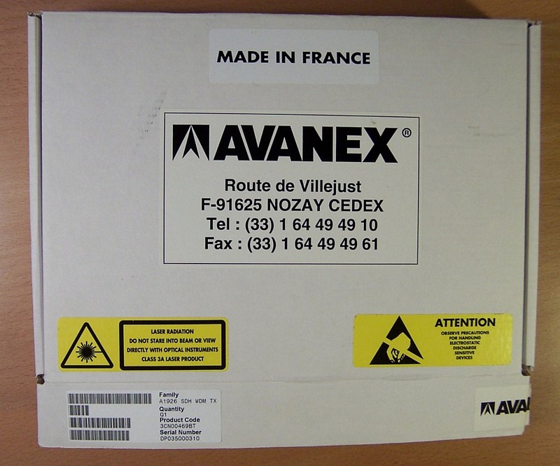 1531.123nm or 1531.896nm 8.37dBm-average(11.37dBm peak) DWDM 2.5Gb laser transmitter module. Avanex P/N: 3CN00469BT, A1926 family