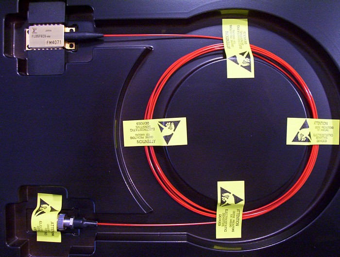 PMF with FC/PC connector. 10mW CW Light Source for DWDM System. Built-in TEC, Thermistor, Monitor PIN PD and Optical Isolator. With FC connector. It has angled end face but not standard APC. It will get near 3dB loss if connecting with FC/PC jumper, and >10dB loss if connecting with FC/APC jumper. So user may change to a standard connector by fusion splice by himself. (We guess the connector is only for evaluation test, after test, user normally cut the connector and fusion-splice with modulator input fiber.)