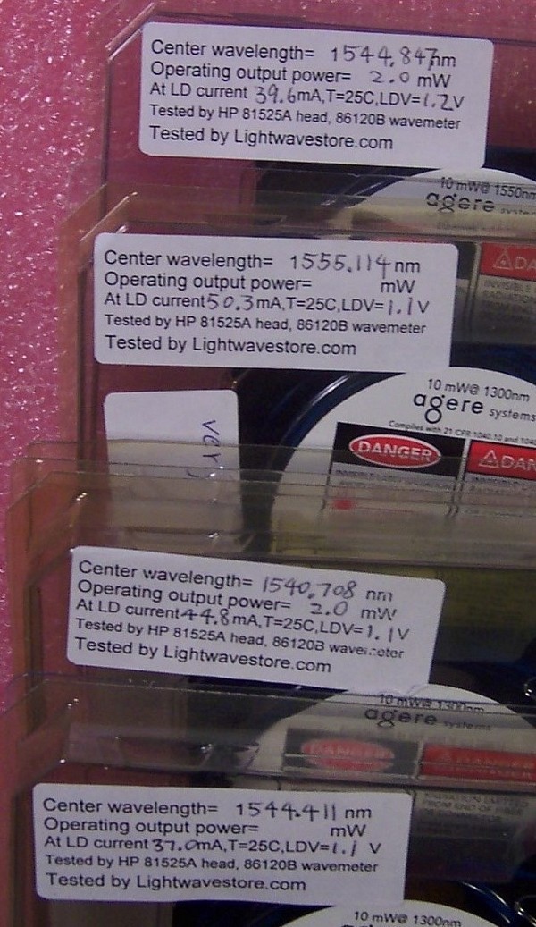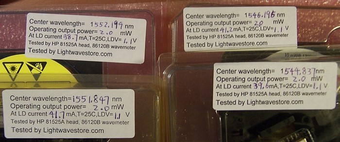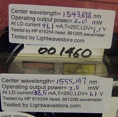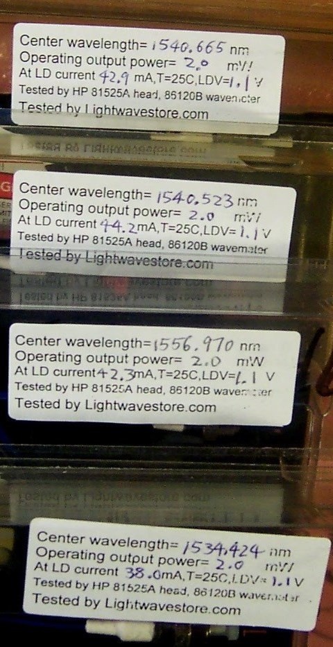 used and soldered in original product pack, Without manufacture test data, last 3 pdf links above are from different samples. Tested good at our lab, see our test result at last 6 photos. 14-pin leads are quite short and but they can fit our E-tek butterfly laser mount, see photos at left.