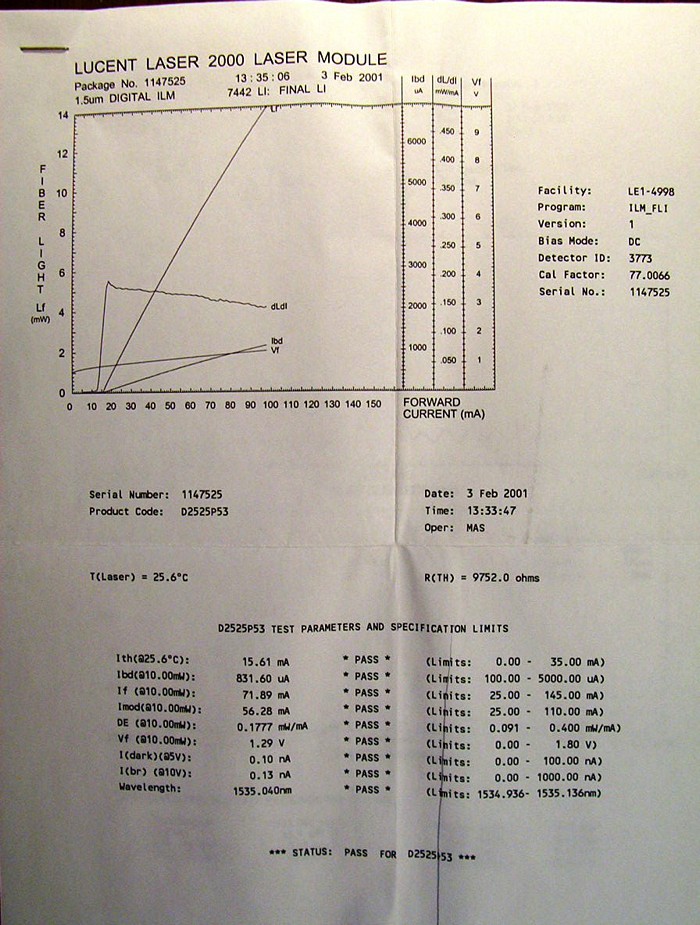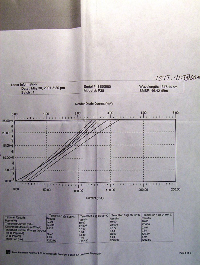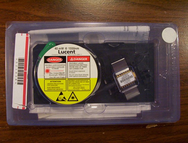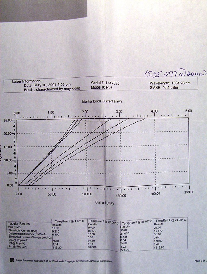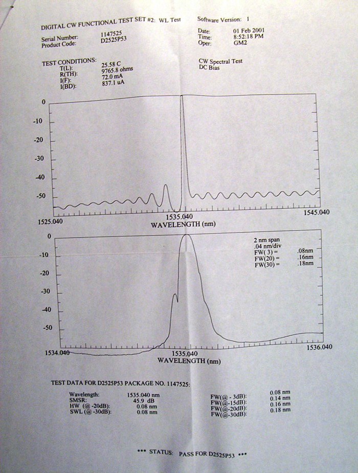 CW Light Source for DWDM System with external modulation. Built-in TEC, Thermistor, Monitor PIN PD and Optical Isolator. PMF 900um-buffered fiber with FC/APC connector.Available wavelengths and qty on April 21, 2010 :1535.04nm: 1pc, D2525P53. 1545.32nm: 1pc, D2525P40. 1546.92nm: 1pc, D2525P38. 1554.94nm: 0pc, D2525P28.