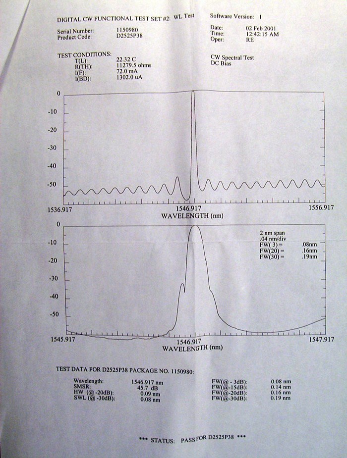 1535.04nm, 1545.32nm, 1546.92nm, or 1554.94nm,  14-pin butterfly DFB laser module, operating power 10mW. model: D2525P