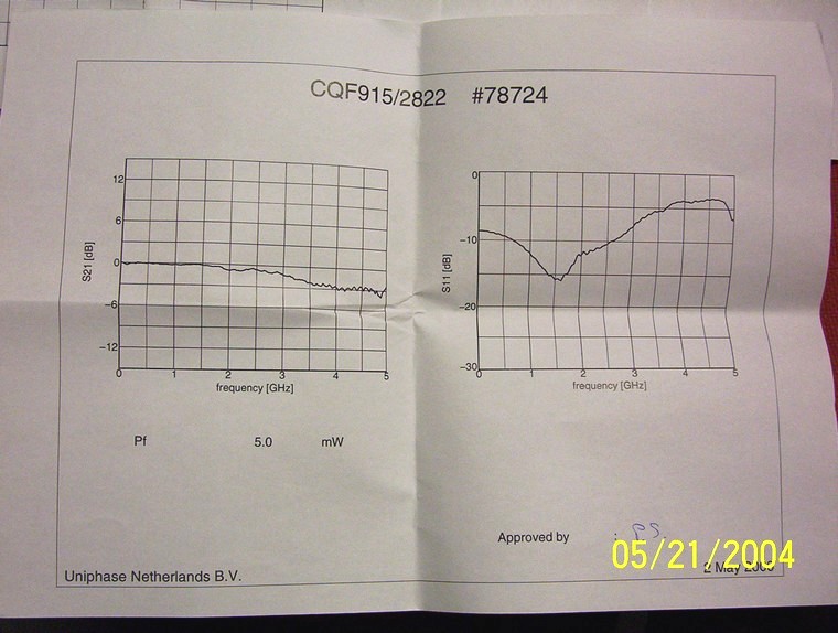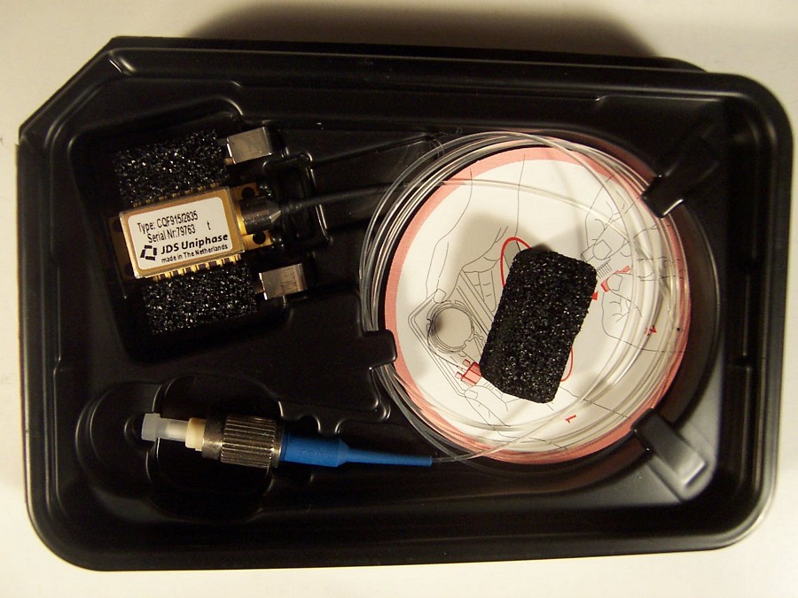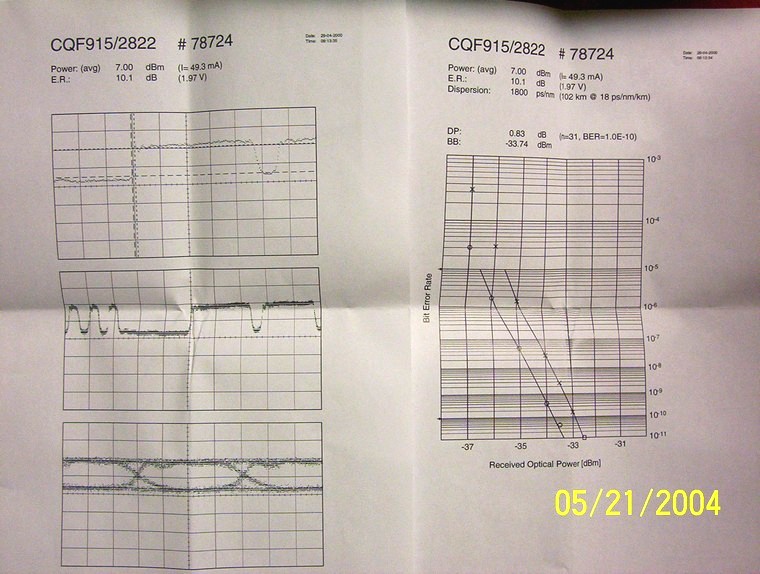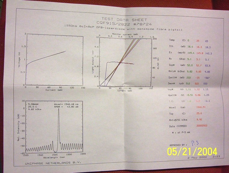 10dBm peak, 7dBm average. With FC/PC fiber connector. Model: CQ915/28xx is equivalent to CFQ915-208/xxx. Data sheet should be same as the pdf link below which is for almost-same model CQF915/208. The only difference between these two models: CQF915/208 is made in USA, CQF915/28xx is made in Netherland.The 3rd, 4th, 5th photos of manufacture test data are for the sold sample CQ915/28 22, are not actually for this CQ915/28 27 sample. Only difference is wavelength.Direct modulation. For 100km WDM/DWDM transmission. WDM/DWDM lasers with wavelengths over 1530-1560nm C-band available at 100GHz-spacing. You may change temperature to tune the wavelength to fit ITU grid.Available wavelength and qty on Oct. 11, 2012:1554.329nm or 1554.41nm, CQ915/2831, qty=2, $1901557.117nm or 1557.657, CQ915/2835, qty=2 (one sample marked "44408" would be equivalent to CQF918/2835, see our test result at last photo below). $180Actual available wavelength, qty, and price will show up after you click “Choose wavelength” menu at the ”Options” section below.