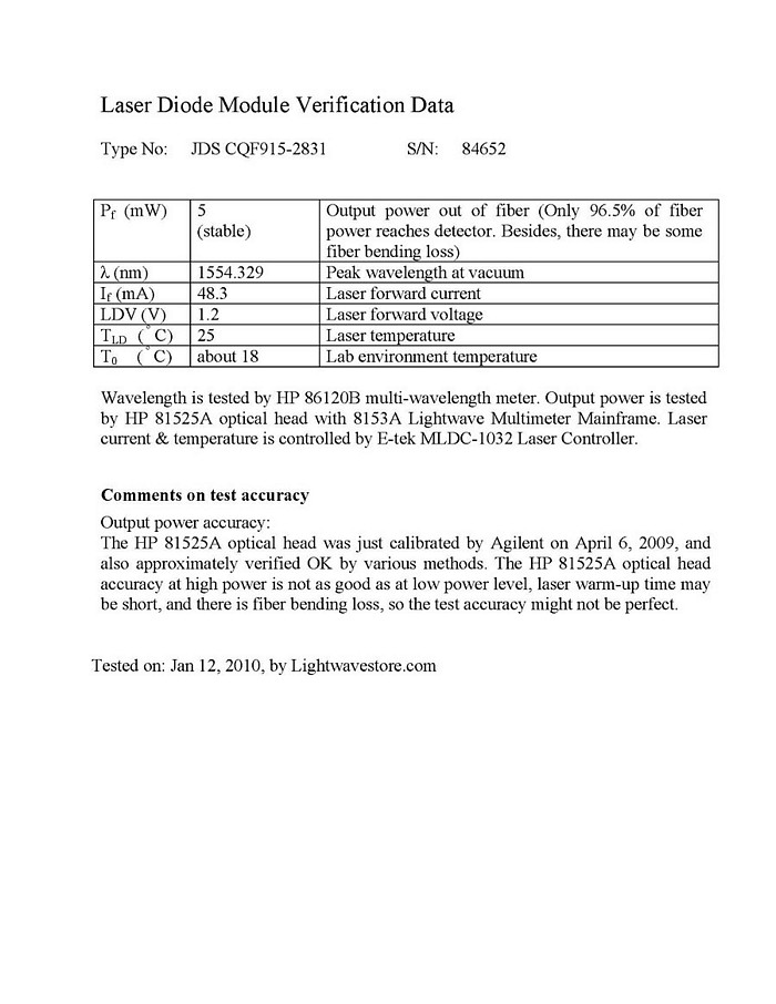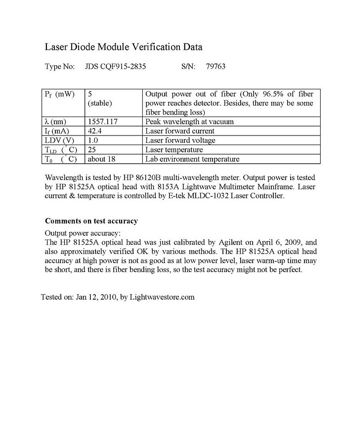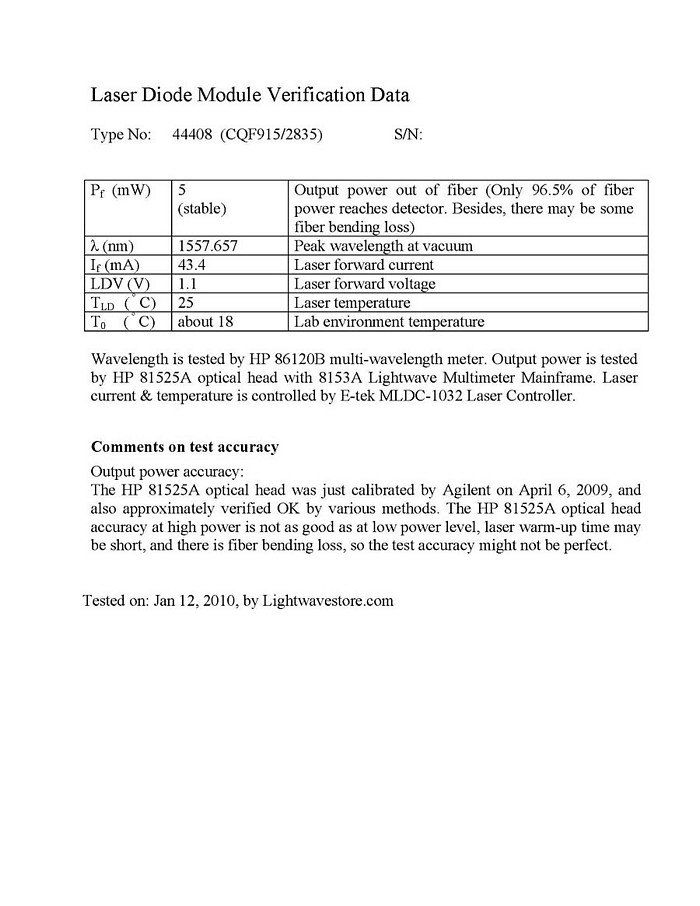 new in original product case without manufacturer test sheet. It is tested good at our lab at CW 5mW (we were too busy to try 10mW at that time), see our test result at the label of last 7 photos below, tested wavelength is at 25 C degree temperature. The The 3rd, 4th, 5th photos of manufacture test data are for the sold sample CQ915/28 22, are not actually for this CQ915/28 27 sample. Only difference is wavelength.