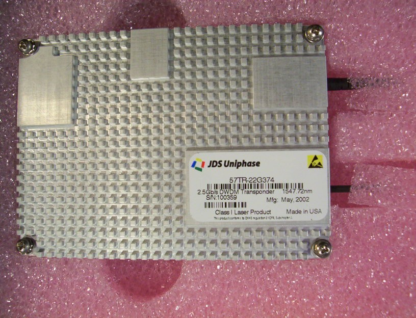 The 57TR Transponder is a DWDM module that is available in specific ITU wavelength transmitter and APD-receiver configurations. This is high power version. It includes CQF413/408 19370 10mW laser (100Km,Tuning 2x100Ghz). JDSU. SC/PC connectors. With its CQF413 Series for 2.5 Gb/s systems, JDS Uniphase is among the first to introduce temperature tunable DMLs. These products are two-channel tunable for the 100 GHz ITU and are available in both 100 km and extended reach 180 km versions and for both low (2.5 mW) and high (10 mW) peak output power levels. The datasheet in the pdf link below is for non-DWDM model with standard low power only.