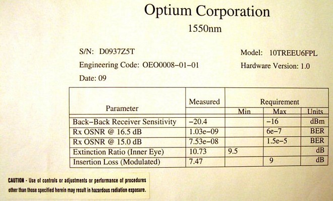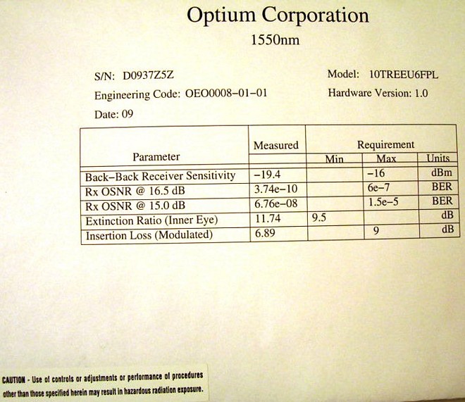 • one 10Gb optical PIN-amp receiver with LC/PC fiber connector. Model: FRM5J142GW.  See datasheet at last  pdf link.