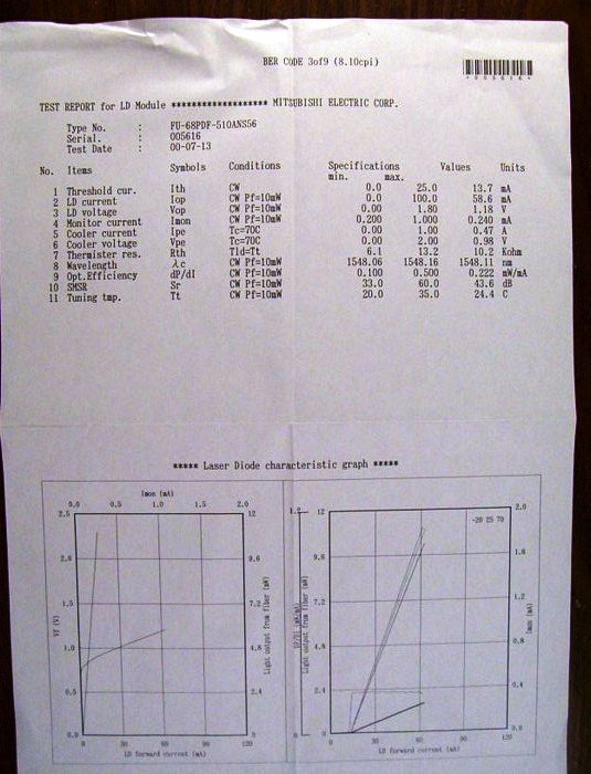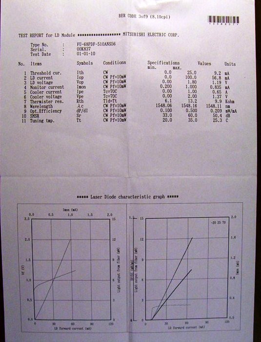 1552.12nm, 1555.75nm, or 1558.58nm 10mW DFB CW laser,  Mitsubishi Type No : FU-68PDF-510ANS66/75/82