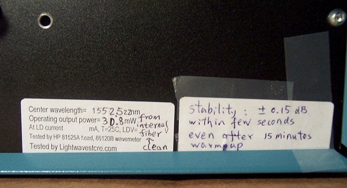 We have tested output power and wavelength without enough warmup. About 30.8mW from internal fiber connector, 1552.522nm. Stability is +/-0.15dB within few seconds even after 15 minutes warmup.