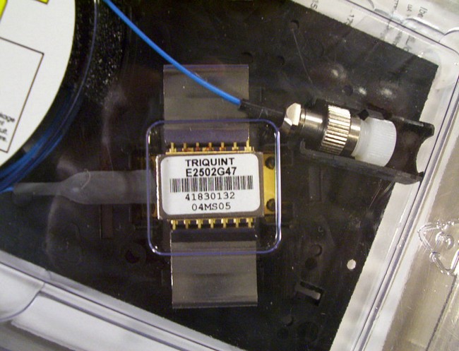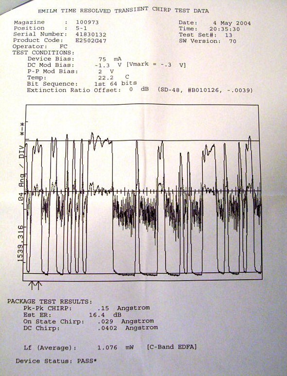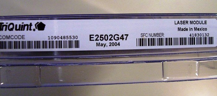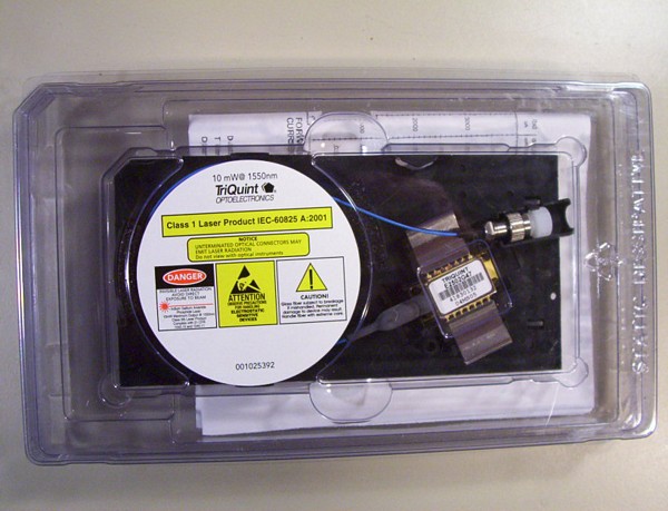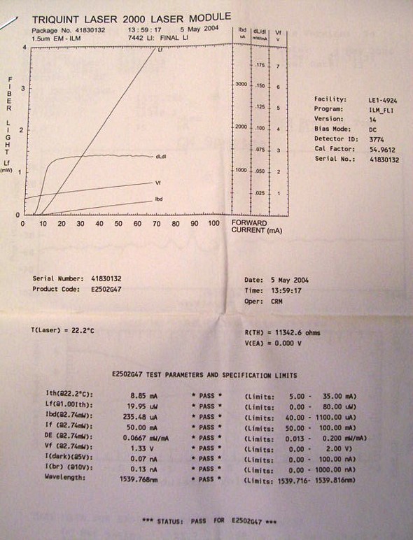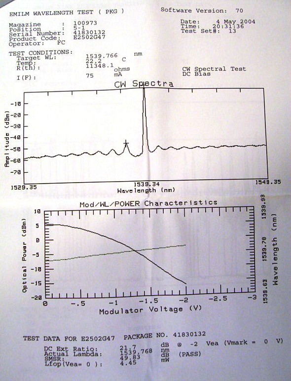 Very low dispersion penalty over 600 km standard fiber. FC/PC connector. With EA modulator. E2502G47 manufacture test data: If=2.74mW. made in May 2004 by Triquint. E2502G30 manufacture test data: If=1.42, 1.42, 1.42, 1.44, 2.41mW. made in Jan. 2004 by Triquint.