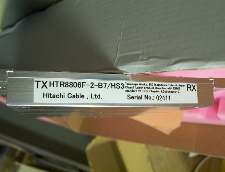 1554.134-1556.959nm 8-ch tunable 10Gb 60km transponder, With 2 FC/PC connectors.  last photo photo below was taken from different wavelength sample. Dispersion tolerance : +/-1200 ps/nm (Zero Chirp). Tx output: min +3, max +6 dBm average power. Rx sensitivity : -24dBm.  HS in P/N means with heat sink.  We can remove these parts from the transponder module by desoldering machine with low-melting point solder, and sell separately upon request.  See datasheet in 1st PDF links.  See 10Gb APD receiver and 20mW PMF CW laser in 3rd and 4th pdf links below.