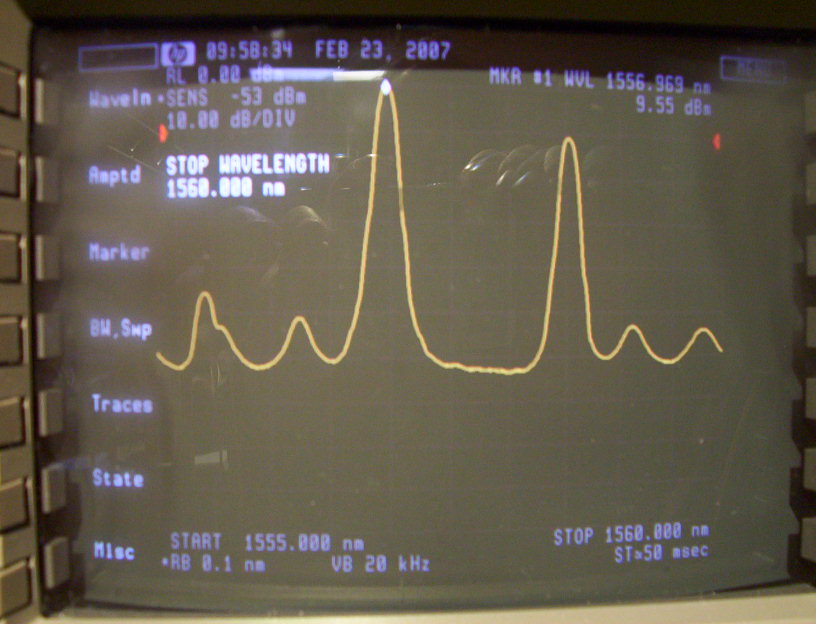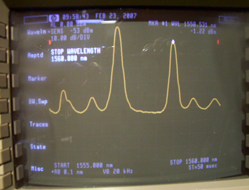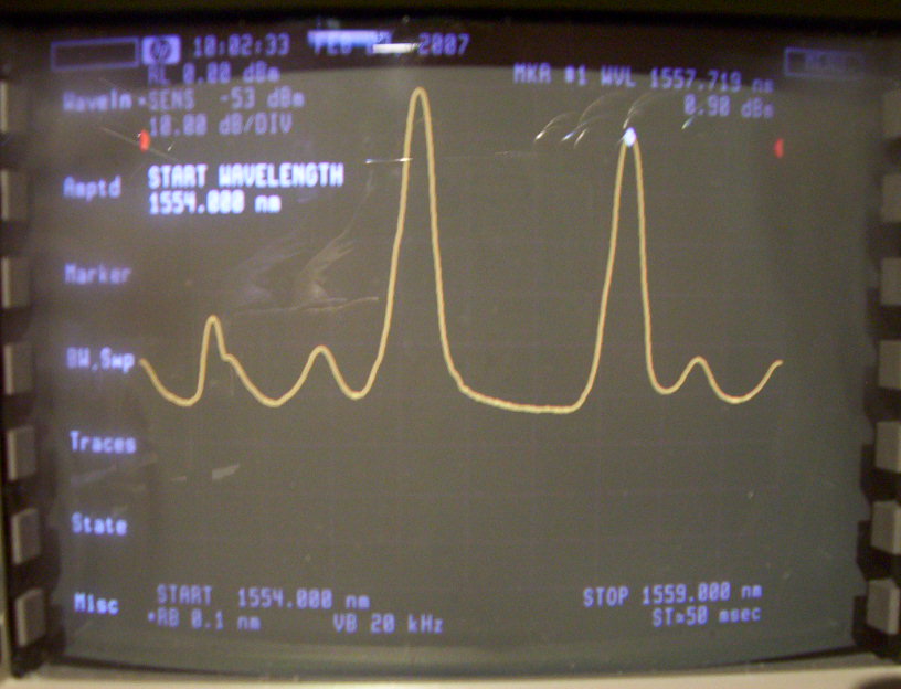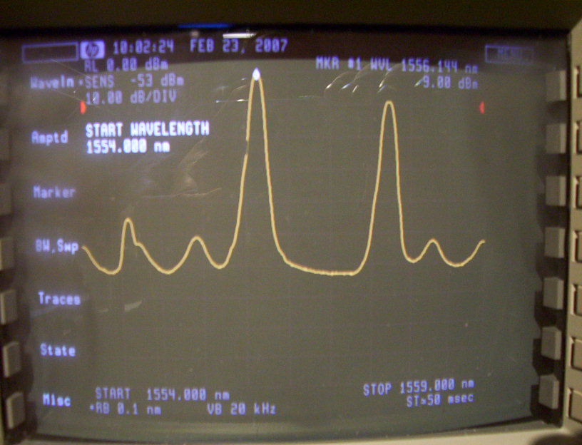 45Mb/s to 2.7 Gb/s 100GHz DWDM transmitter. 1556.55nm, temperature tunable over two 100GHz channels (n, n-1). Typical average power 7dBm. Maximum average power 10dBm. 3200ps/nm dispersion 180km. -15 to 80 degrees C open housing with heat sink . With MU fiber connector. This trasmitter includes 10mW temperature tunable WDM laser module, JDS P/N: CQF413/608-19290. The CW output power and center wavelength are tested in our lab and meet the spec (ouput power could be a little higher if re-clean the connector), but the 2nd-mode wavelength is not negligible. The 1st and 2nd spectrum photos below are without wavelength tuning. The 3rd and 4th spectrum photos are after 100-GHz shift. The actual center wavelength should be corrected by adding 0.47nm to tested wavelength result. Reserve for our lab at this moment. The photos below are for the sample with sink. The other two units are without heat sink and untested.