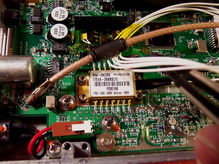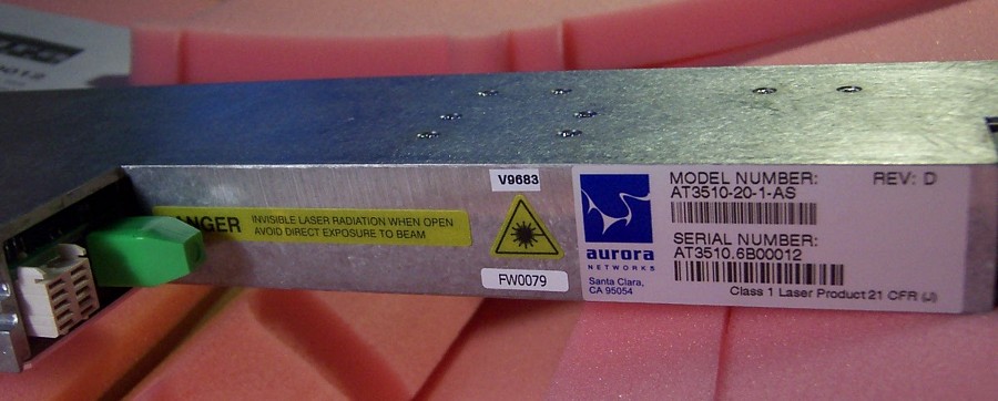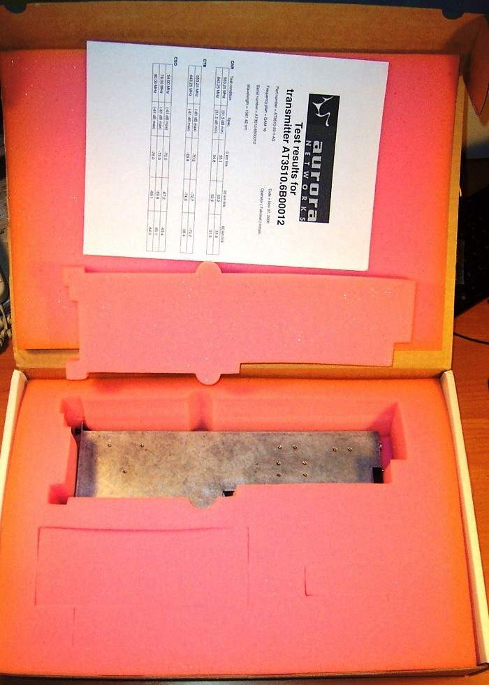 10dBm transmitter by Aurora. The test data is almost same as the test data of Scientific Atlanta reverse transmitter (P/N: PDMT1500-08SD-SA-IT23, store product code OMS-Tx-1550-211C), so this should be also reverse transmitter. With SC/APC fiber adapter. With manufacture test data (see last two pdf links below). With Ortel 10dBm 1751A-26BBSC10 laser, see specification at the 3rd and 4th pdf links below.