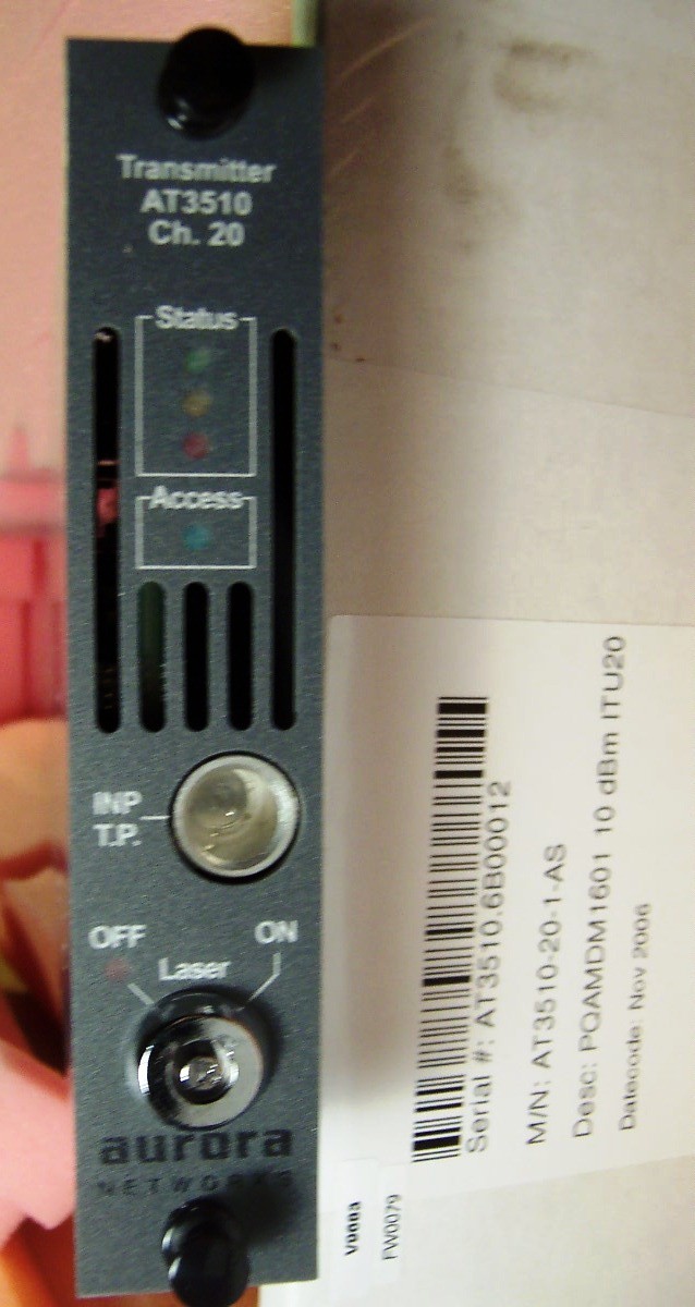 The AT3510 series high performance Analog Narrowcast Transmitters are a key element of Aurora Network's Passive HFC architecture and are designed for Dense Wave Division Multiplexing (DWDM) applications for forward path transmission of narrowcast digital services. Each transmitter's wavelength is specified as one of 40 wavelengths on the 100 GHz DWDM ITU grid (ITU-T G.694.1). AT3510G transmitters incorporate advanced predistortion circuitry to enable transmission of up to 16 or 32 QAM modulated channels per wavelength. Transmitter output power is 10 dBm for maximum network performance and application flexibility.