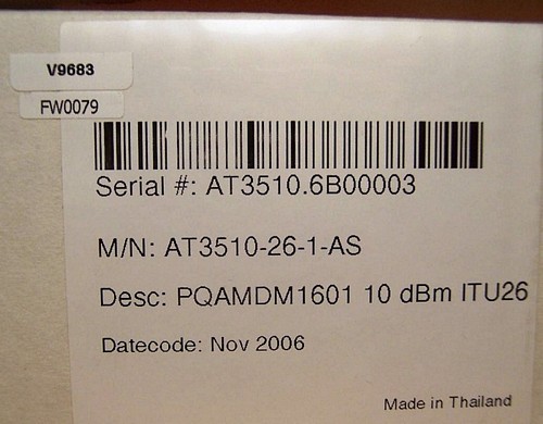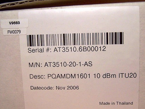 Wavelength and M/N: 1561.42nm, M/N: AT3510-20-1-AS, Desc: PQAMDM1601 10dBm ITU20; 1560.61nm, M/N: AT3510-21-1-AS, Desc: PQAMDM1601 10dBm; 1559.79nm, M/N: AT3510-22-1-AS, Desc: PQAMDM1601 10dBm; 1556.56nm, M/N: AT3510-26-1-AS, Desc: PQAMDM1601 10dBm.