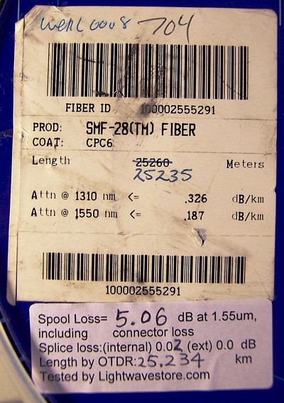 Very good cosmetic condition. There is a small crack on plastic cover, but the cover and handle are still very good. Fiber roll is well winded on the drum. Fiber loss is verified very well and matches the product label well (5.06 dB). Tested fiber length is 25.234km by OTDR at our lab, which is within instrument accuracy, considering the factors of group index of refractive deviation (we set Neff as 1.4682) and extra fiber pigtail length spliced on each end of fiber spool. See our loss and length test result at the label of last photo.