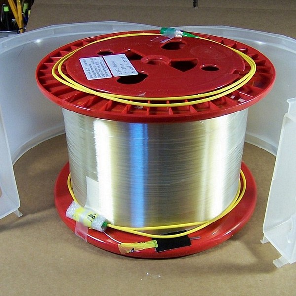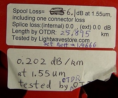We fusion-spliced two FC/APC connectors in 3mm SMF-28e cable. Splice loss is very low. We tested spool loss is 6.1dB at 1.55um. We measured the fiber attenuation is only 0.202dB/km by OTDR. So there is extra bending loss(about 0.6dB) involved near two fiber spools ends. Fiber length is measured as 25.895, assuming effective refractive index is same as Lucent normal SM fiber 1.4666.