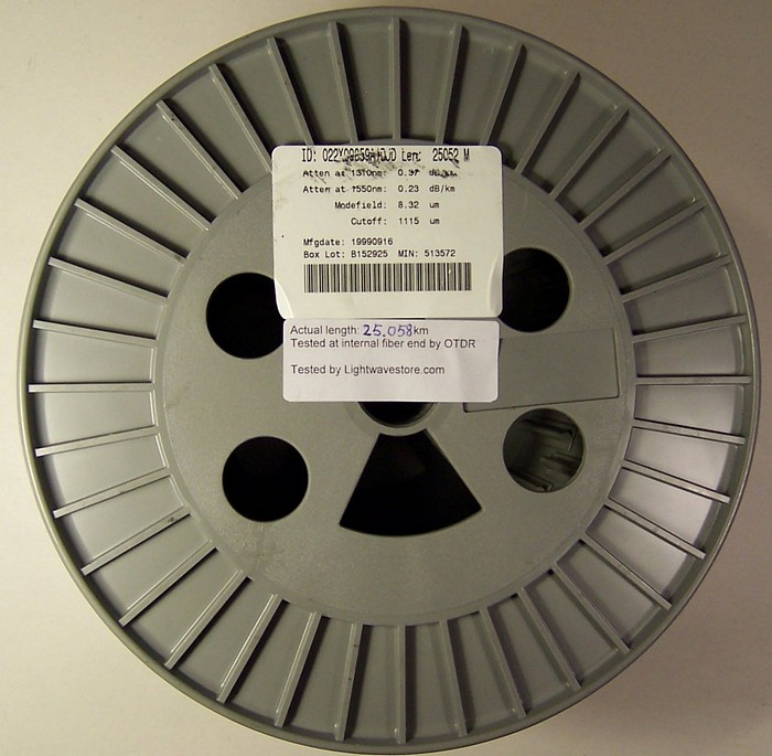 25km Lucent truewave-RS fiber spool.  Fiber is cut at spool internal end, so you cannot use it for transmission test.