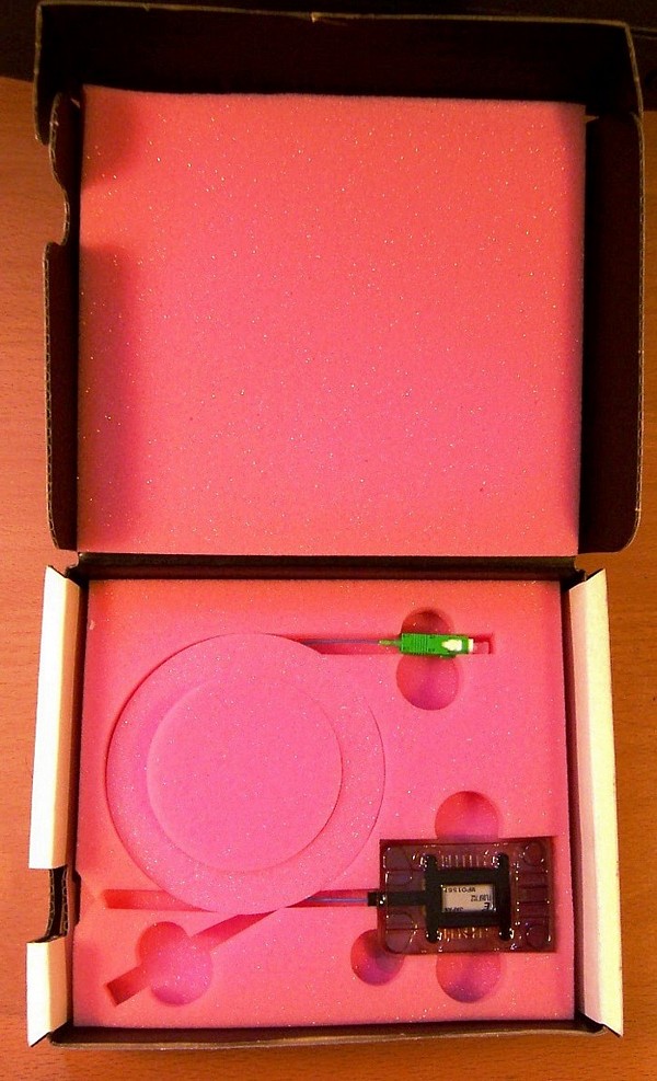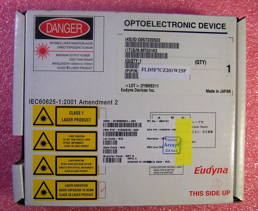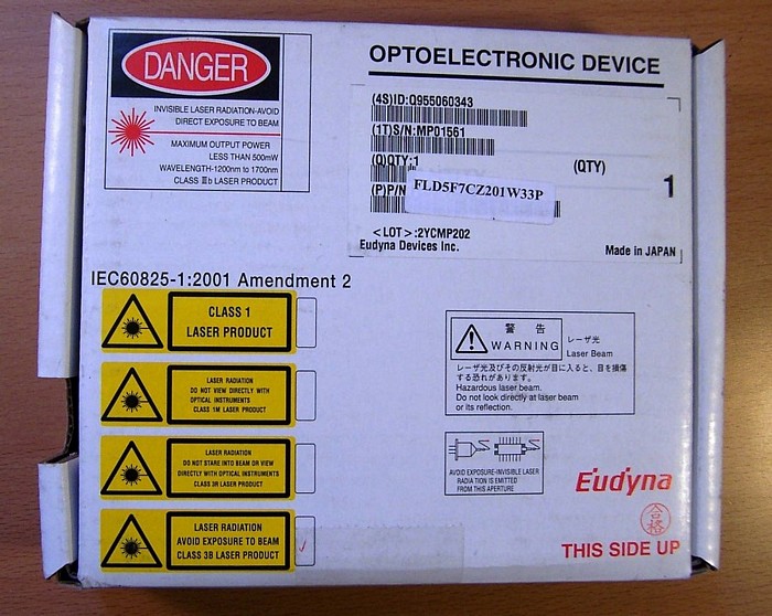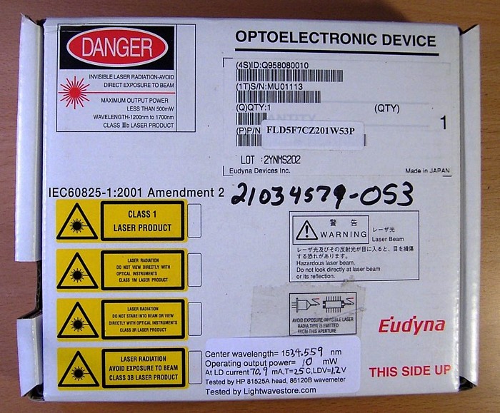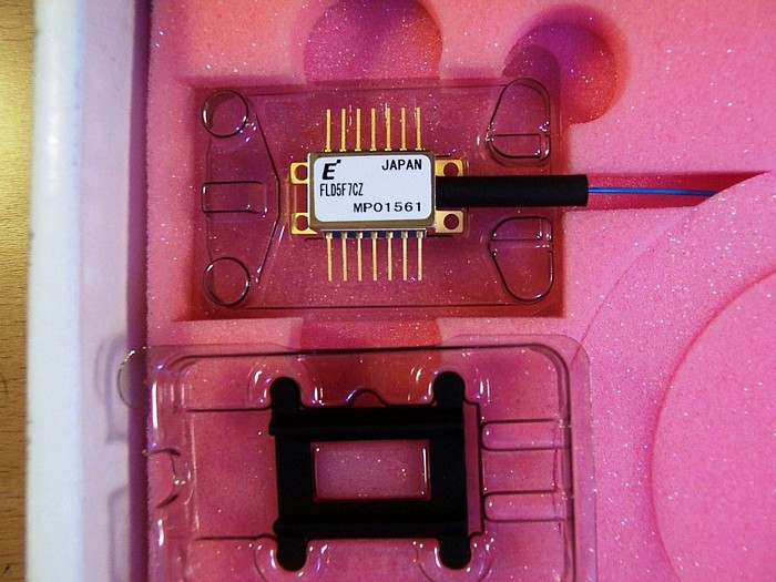 Eudyna originally supplied these lasers to Ortel and OEM maker Fabrinet, with Fabrinet P/N: 21034579-0xx (e.g., P/N: 21034579-034 for FLD5F7CZ201W34P). It is 10mW laser since they are used in 10mW analog transmitters, for example, 1.55um 10dBm narrowcast analog transmitter, Aurora M/N: AT3510-xx-1-AS. Store Product Code: OMS-Tx-1550-222C. It is replacement of Ortel 10dBm 1751A-xxBBSC10 laser in 10mW Aurora AT3510 analog transmitter systems. We also got some samples with 10mW analog transmitter system together. DFB DWDM Direct Modulation Laser. 14-pin butterfly. SMF with SC/APC connector. Without manufacture test data. It seems very similar to FLD5F7CZ-J. You may find more info in similar-model datasheet at the 1st pdf link below. Made in Japan. Available wavelengths on Aug. 15, 2016 (see current qty at the price table just above the photos): FLD5F7CZ201W53P, 1535.04nm (tested as 1534.56nm at 25 C at our lab) FLD5F7CZ201W34P, 1550.12nm FLD5F7CZ201W33P, 1550.92nm FLD5F7CZ201W32P, 1551.72nm FLD5F7CZ201W25P, 1557.36nm