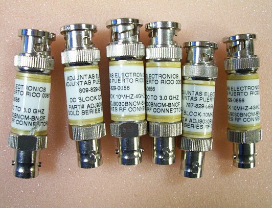 DC block DC to 3 Ghz . Male to female BNC interface. P/N: ADJ9030BNCM-BNCF. Not sure if it is 75 or 50 OHM.The low end cutoff freq may be higher than expected (based on test result for 18GHz DC blocker of same maker), so it may not be suitable for standard optical communication systems.