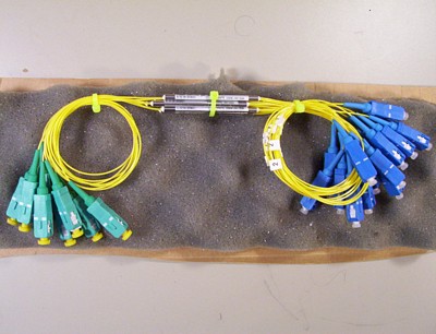 900um-buffered SMF-28 fiber pigtails with one SC/APC connector at common port and two SC/PC connectors at splitting ports. Grade: S. IL spec: 3.4dB.