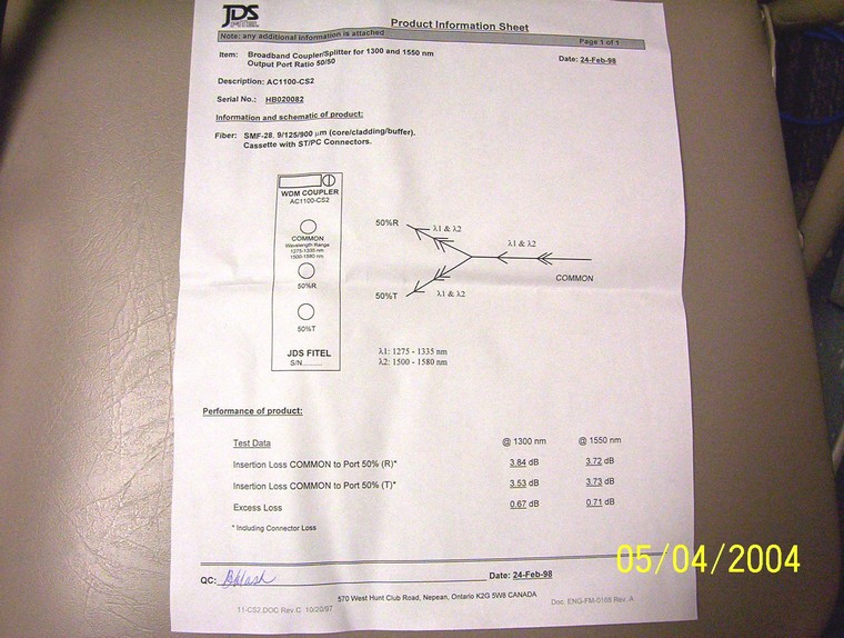 50% 1x2 splitter for both 1310/1550nm wavelength windows, w/o testsheet