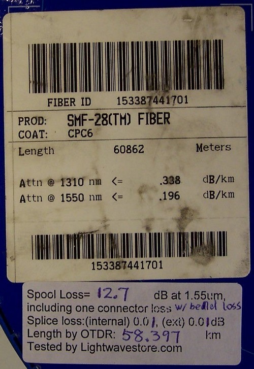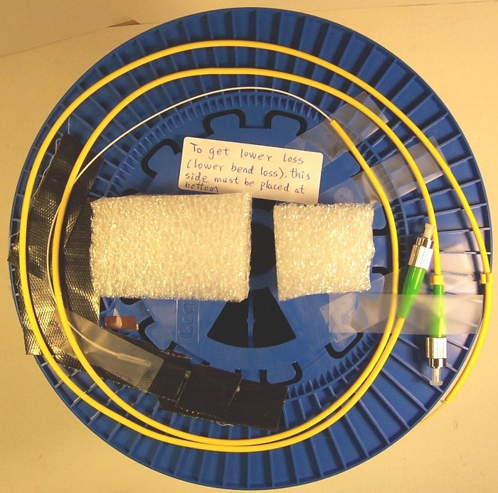 58.397km SMF-28 bare fiber spool, with two FC/APC connectors. fiber spool loss is slightly higher than expected due to extra bending loss.