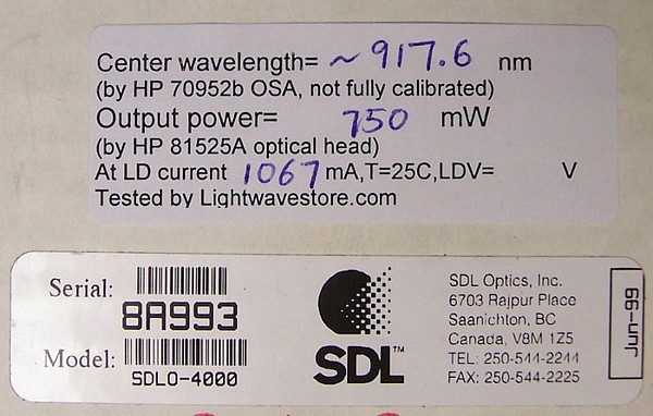910-925nm >750mW multimode pump laser. High power, high reliability. for double-clad fiber amp. or Raman amp. SLD/JDSU product code: SLDO-4000