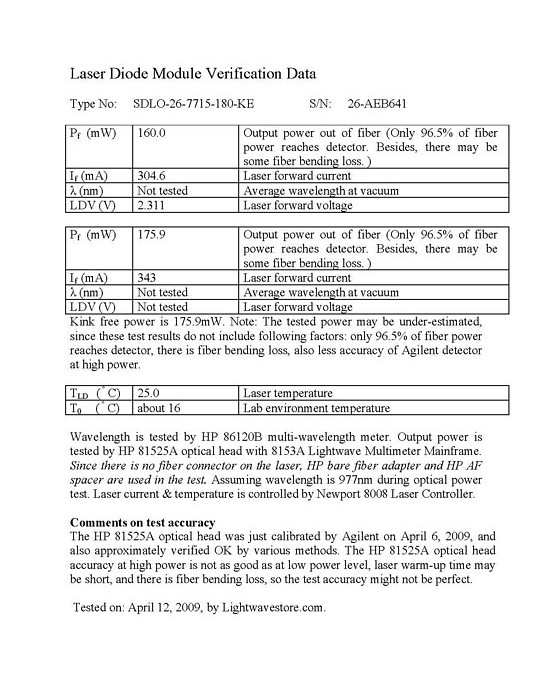 new in original product case, without manufacture test sheet. All lasers are tested OK our lab, operating output power and drive current meet specification, sample average wavelength is about 976.4nm at our lab. Kink-free power of each laser is verified is near 180mW (>168mW at least) at our lab. See our test reports at last two photos below.