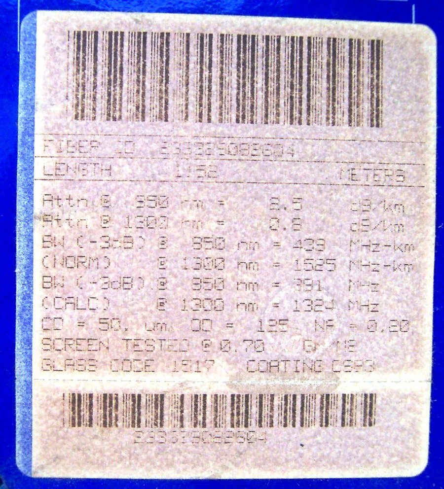 without connectors. There are product specification label: Attn:2.5,0.8dB/km@850,1300nm also BW data, as shown in the 2nd photo below.