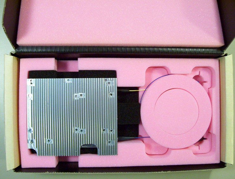1.55um 8-ch tunable 10Gb DWDM transponder, P/N: FIM83011/5052W9240. Wavelength is 1558.173nm(192.40THz) based on Wxx in P/N. There is dual-drive 10Gb modulator (Fujitsu P/N: H74M-5208-J131), it looks similar to FTM7921ER, except that two RF ports are without connector interface, two RF copper stripes are soldered with PCB, the other 3 soldering points around RF soldering are ground, as shown at 5th and 6th photos below. There is a PMF CW laser (Fujitsu P/N: FLD5F15CA/002W9240), We very believe it is 20mW laser since Fujitsu FIM83-series 80-km MZ-LD type transponder output specification >3dBm. Last photo photo below was taken from different wavelength sample), and 10Gb APD receiver (Eudyna P/N: FRM5N141GW). With 2 MU connectors. With heat sink. We could remove these parts from the transponder module by desoldering machine with low-melting point solder, and sell separately upon request.