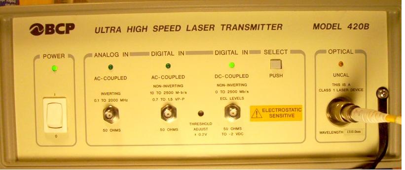 Description: The BCP 420B ultra high speed laser transmitter is designed to be a source of high quality digital and analog fiber-coupled optical signals. In the digital mode, the optical output waveform conforms to the eyemask requirements of BellCore GR-253.