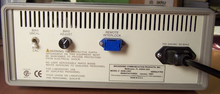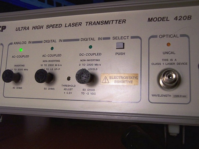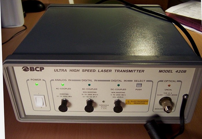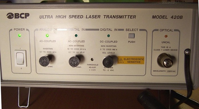 Description: The BCP 420B ultra high speed laser transmitter is designed to be a source of high quality digital and analog fiber-coupled optical signals. In the digital mode, the optical output waveform conforms to the eyemask requirements of BellCore GR-253.