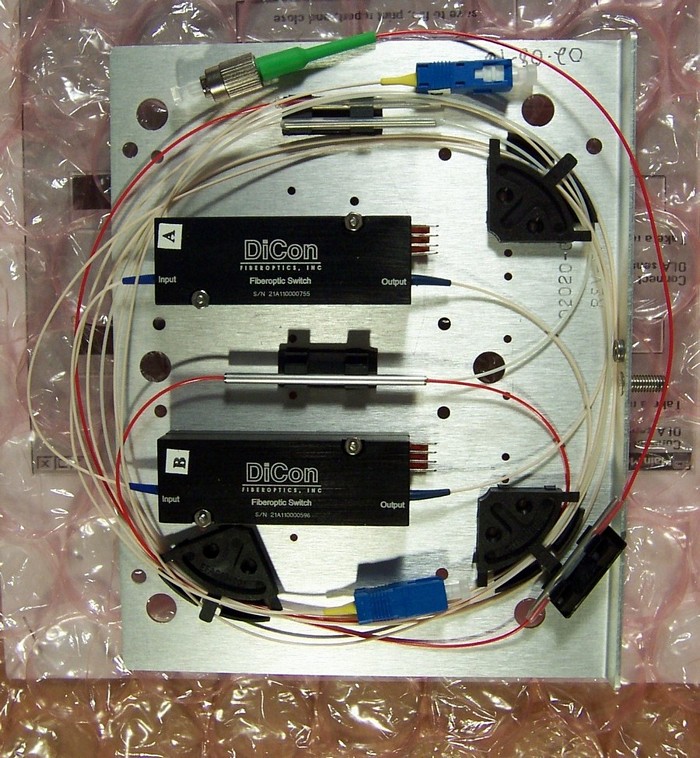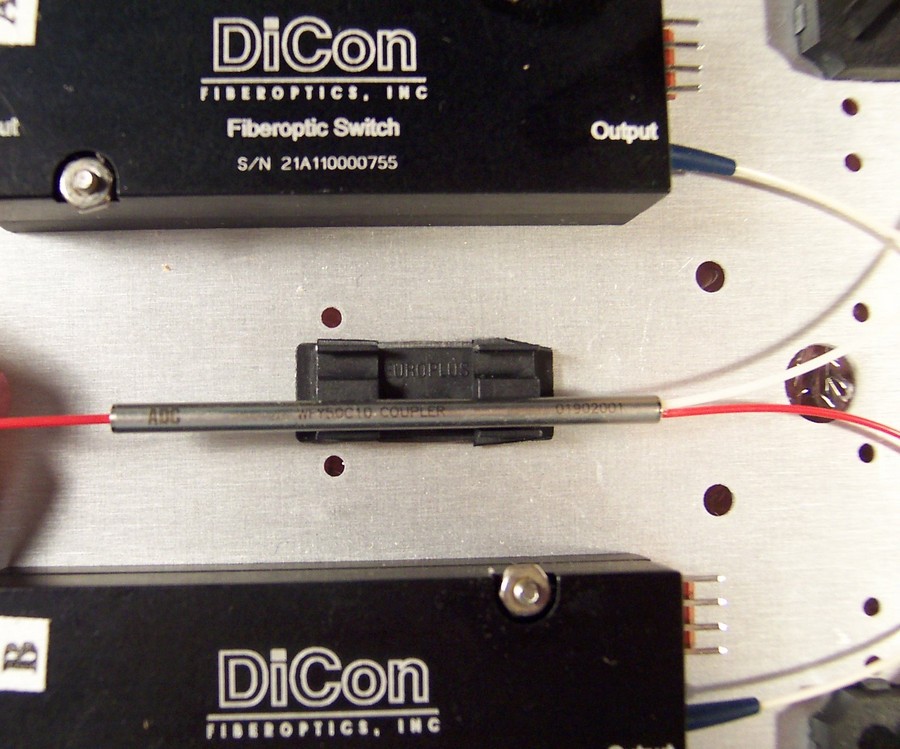 Combo of dual Dicon 1x1 switch and one ADC 1x2 3dB coupler. For 1.55um. Mounted on Aluminum plate. 'Sell As Is'. Without test data